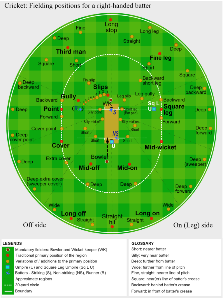 It’s worth noting that most fielding positions were named with right-handed batters in mind. Although cricket has had many great left-handers, the early top batters were mainly right-handed, leading to fielding strategies tailored for them.