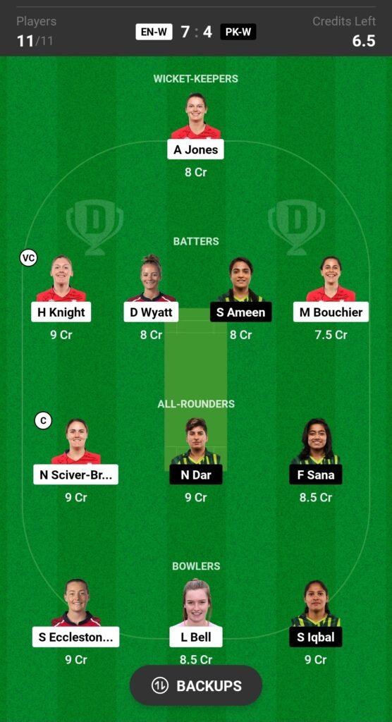 ENG-W: Heather Knight (C), Maia Bouchier, Alice Capsey, Danielle Wyatt, Nat Sciver-Brunt, Tammy Beaumont, Amy Jones (WK), Charlotte Dean, Lauren Bell, Kate Cross, Sophie Ecclestone.