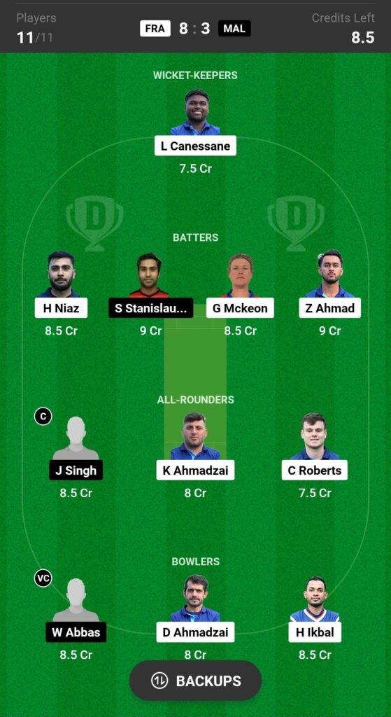 FRA: Christian Roberts, Gustav Mckeon (C), Hamza Niaz, Mukhtar Ali Ghulami, Lingeswaran Canessane(WK), Zain Ahmad, Noman Amjad, Kamran Ahmadzai, Dawood Ahmadzai, Rahmatullah Mangal, Hossain Ikbal