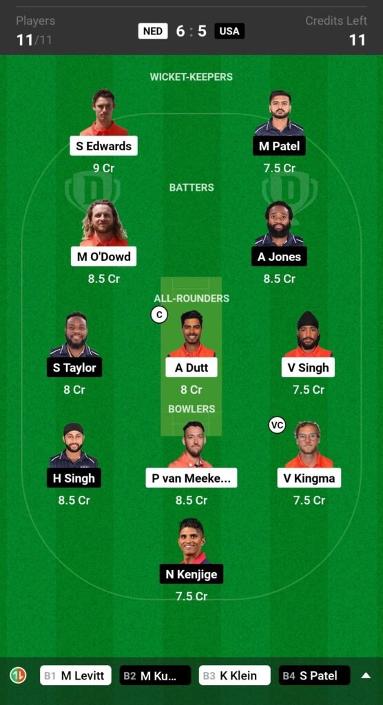 ALSO READ: The Sportpark Duivesteijn in Voorburg is known for being a bowling-friendly pitch. It has a grassy surface that helps bowlers, especially seamers, to get movement with the ball. The longer boundaries also make it harder for batsmen to score easily. The pitch will offer bowlers turn and deviation, making it tough for batsmen. Match Performance: NED : Michael Levitt, Max ODowd, Vikramjit Singh, Scott Edwards (c & wk), Noah Croes, Shariz Ahmad, Kyle Klein, Aryan Dutt, Paul van Meekeren, Vivian Kingma, Musa Ahmed USA : Steven Taylor, Smit Patel (wk), Monank Patel (c), Aaron Jones, Milind Kumar, Shayan Jahangir, Shadley van Schalkwyk, Harmeet Singh, Jasdeep Singh, Nosthush Kenjige, Yasir Mohammad ALSO READ: READ MORE: