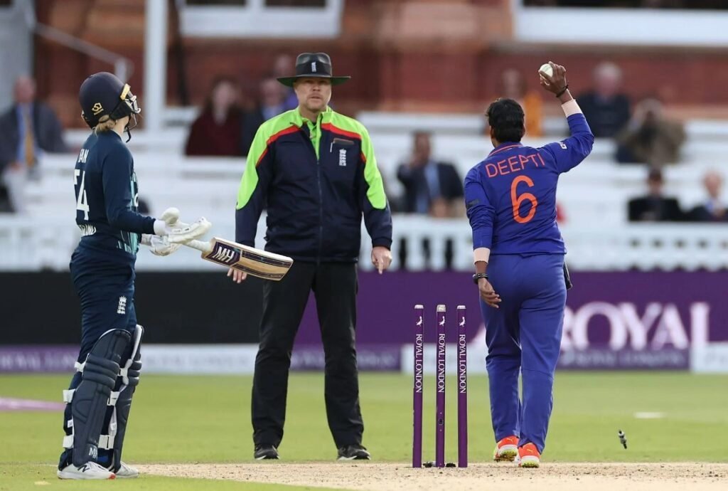 England Women were chasing a target of 170 runs to win, after losing the first two ODIs. They struggled early on and were 65/7, but managed to recover to 153/9. During the 44th over, Deepti Sharma, the bowler, noticed that Charlie Dean, who was not batting, had wandered too far from the crease before the ball was bowled. Deepti stopped her delivery, calmly removed the bails with Dean (scoring 47 runs) out of position.