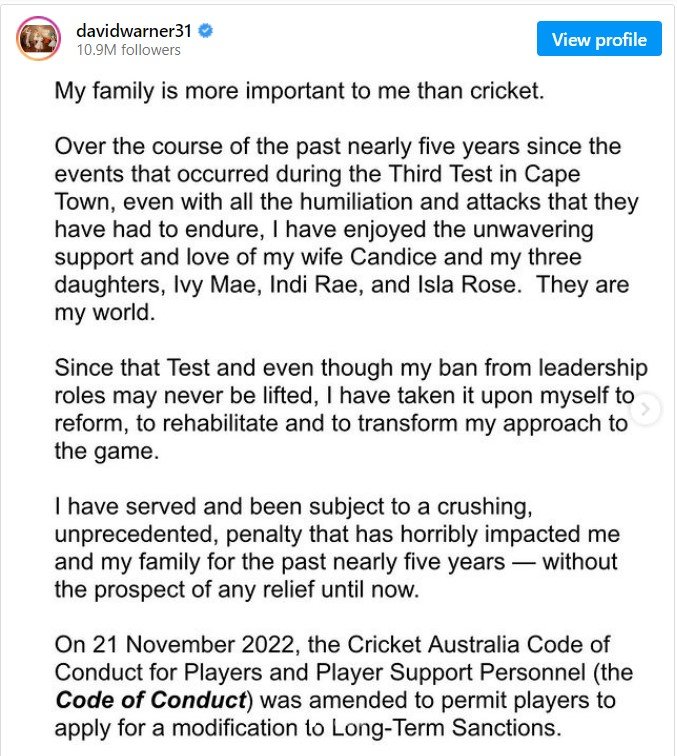 5. With a harsh post, David Warner withdraws his appeal against the captaincy ban
