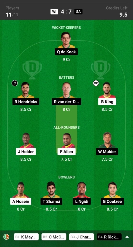The West Indies (WI) are playing against South Africa (SA) in the 3rd T20I match. Both teams are trying very hard to win. The West Indies might struggle against South Africa, and it seems like South Africa is likely to win.